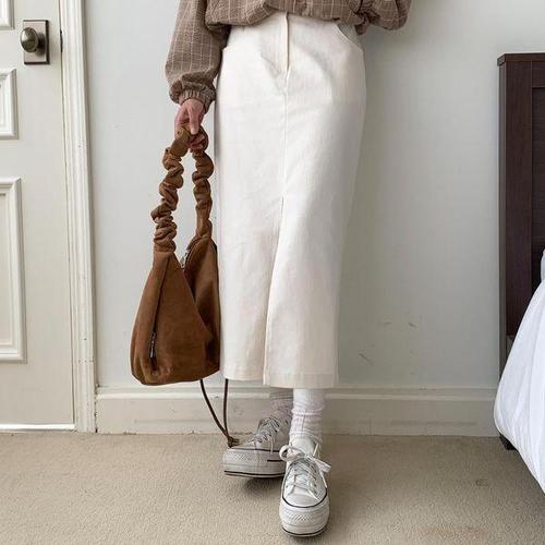 [하프클럽/]여자 심플 면 코튼 슬릿 뒷밴딩 H라인 롱 스커트