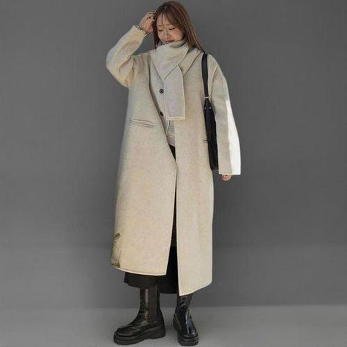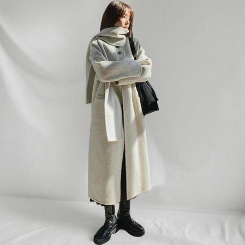 [신상오픈런]여성 울 롱 코트 노카라 머플러 세트 루즈핏