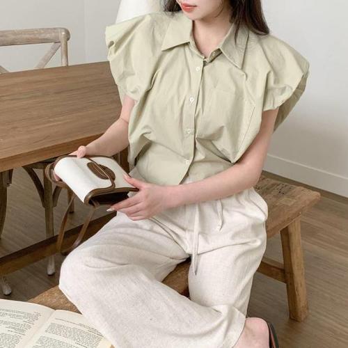 [신상오픈런]|KHH2C81|히지울 프릴장식 카라 썸머 여성 민소매 짧은 셔츠 블라우스_18158038_597559