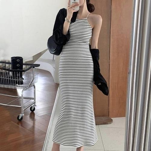 해피유통 여성 여름 스트라이프 민소매 슬림핏 롱 원피스 클래식하고 스타일리시한 디자인zhq