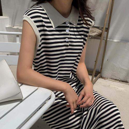 |KHO55E3|여성 스트라이프 롱 원피스 카라넥 민소매 면혼합 드레스