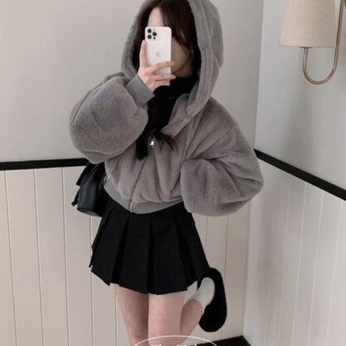 [고중량양면] 고미 도톰 크롭 밍크 후드집업 / 겨울 두꺼운 긴팔 여성 여자 뽀글이 양털 아우터 귀여운 연말룩 루즈핏 오버핏