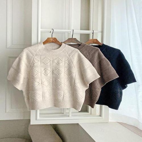 [옷자락] 여성 클래식 바스트 패턴 절개 라운드넥 반팔 니트