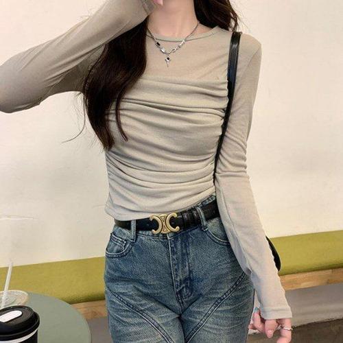 [신상오픈런]여성 힙무드 시스루 바스트 셔링 슬리핏 긴팔 티셔츠