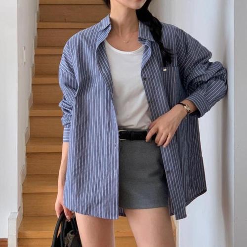 [옷자락] 여성 면혼방 스트라이프 포켓 박스핏 남방 셔츠
