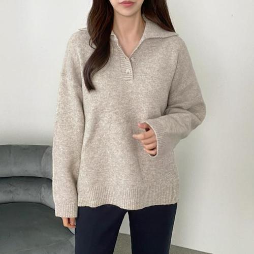 여자 민무늬 카라티 롱슬리브 박스 벌룬 티셔츠