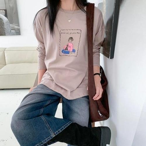 [옷자락]여자 캐주얼 프린팅 박스핏 라운드넥 긴팔 티셔츠
