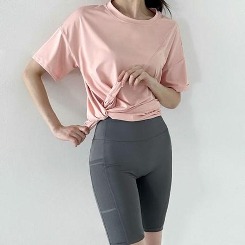 [신상오픈런]여성 단색 스판 절개 반팔 티셔츠와 5부 레깅스 세트