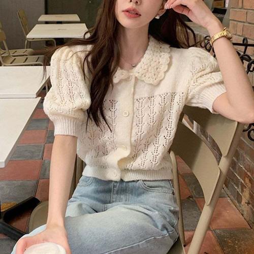 [옷자락]여성 에스닉 패턴 짜임 펀칭 카라 반팔 니트 가디건