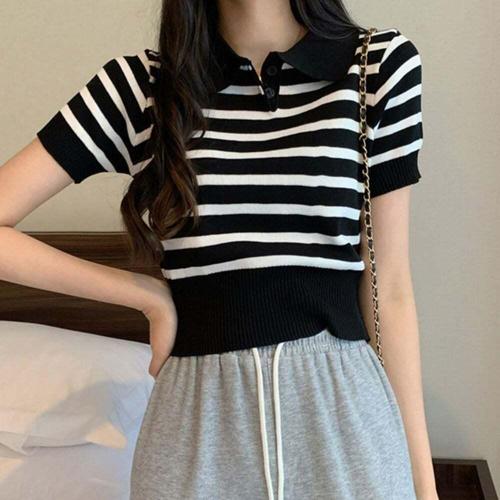 [모노무드]모노무드 여름 스트라이프 패턴 크롭 기장 카라 반팔 니트