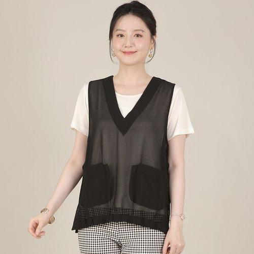 [애비뉴투지]엄마옷 쉬폰 시스루 브이 밑주름 밴드 주머니 여성 여름 트임 조끼 V08512