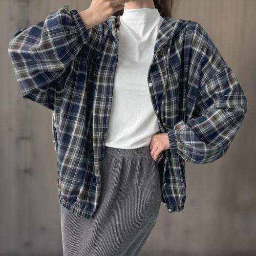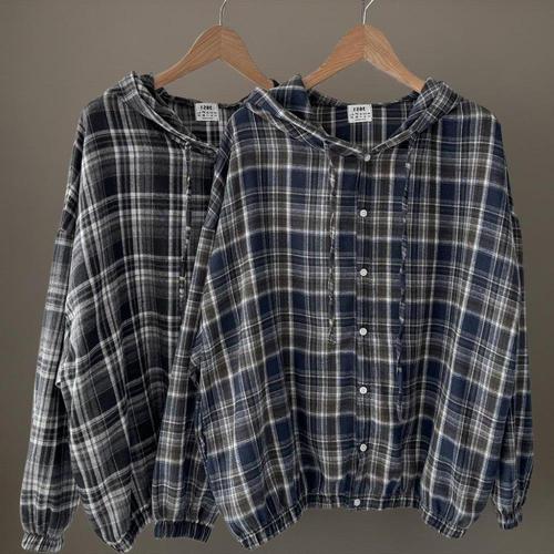 [신상오픈런]여성 체크 남방 밴딩 빅사이즈 후드 루즈핏 퍼프 셔츠