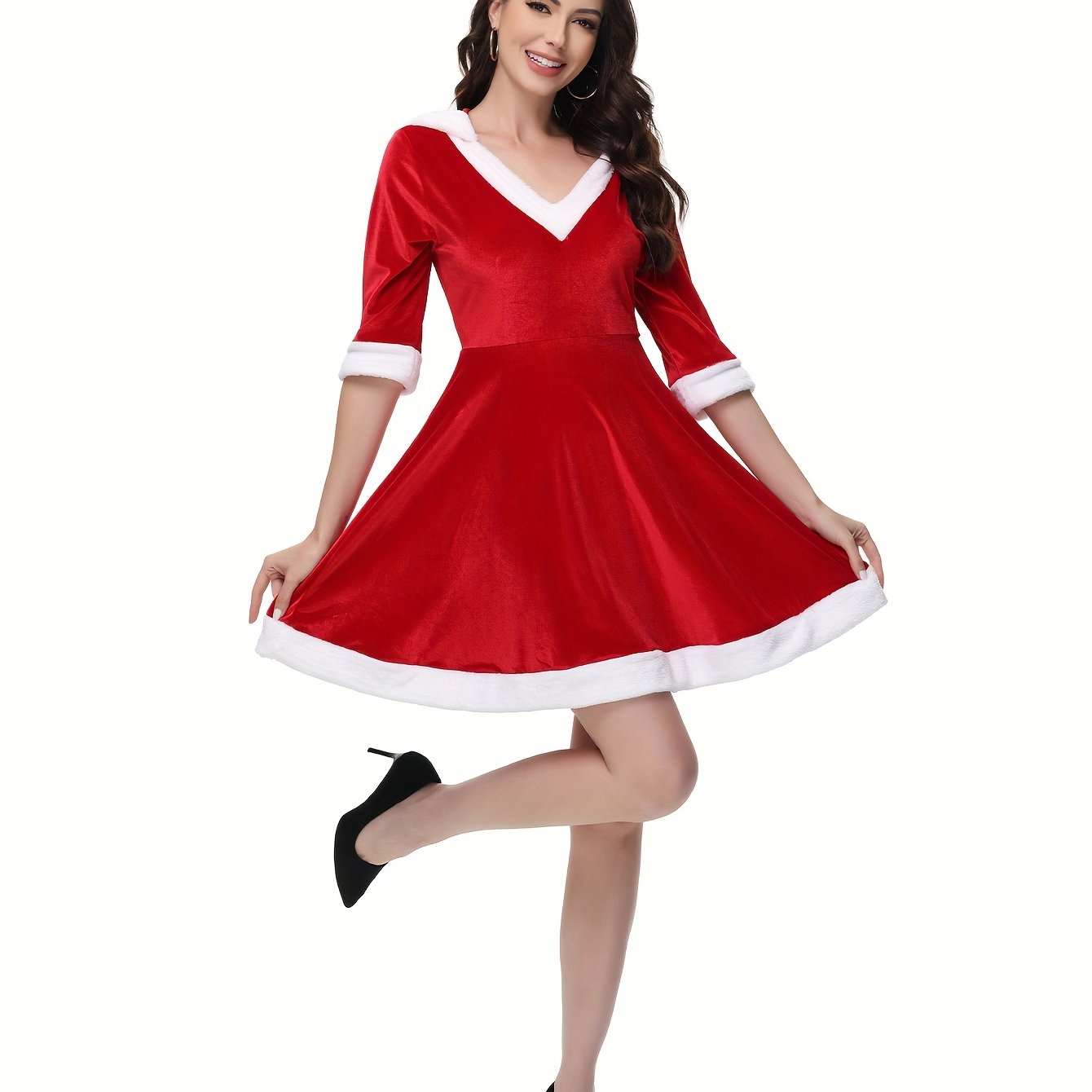 TEMU 여성용 섹시 산타 클로스 코스튬 - 레드 & 크리스마스 드레스, V넥, 긴소매, 러플 헴, 파티, 사진 촬영, 테마 이벤트에 적합, 크리스마스 코스튬 | V넥 드레스 | 러플 헴 드레스, 크리스마스 코스튬
