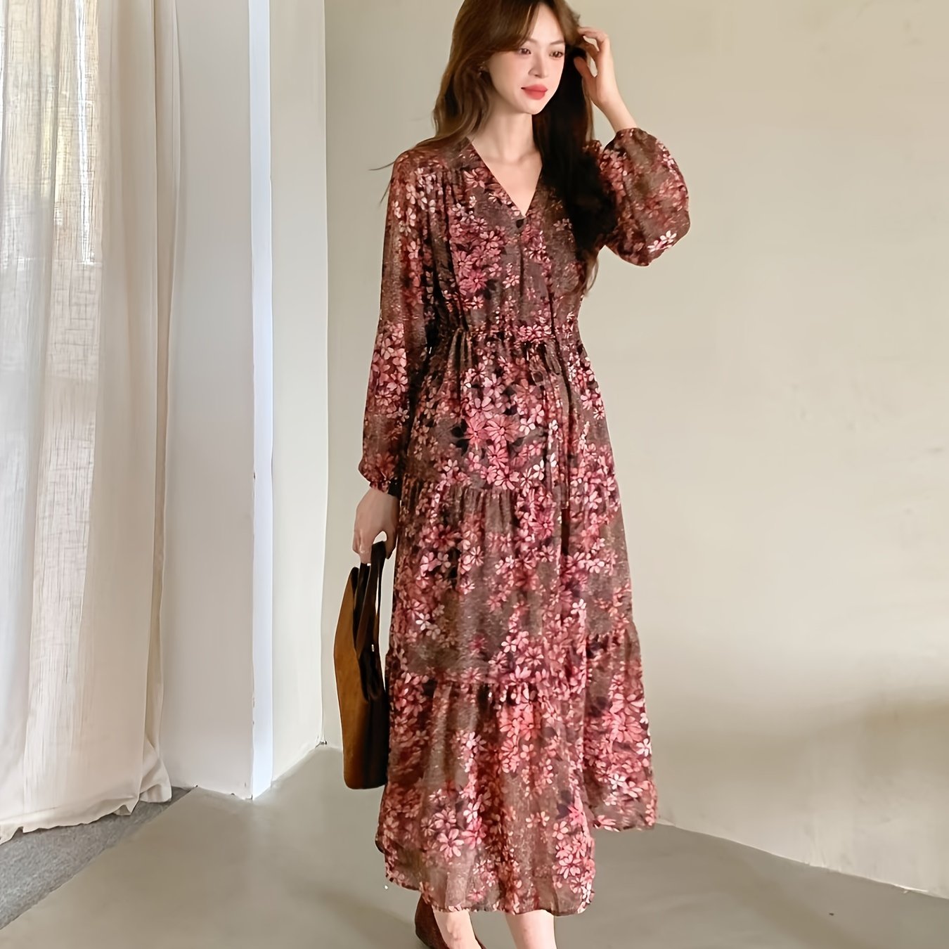 TEMU 새로운 V넥 무릎길이 시폰 맥시 드레스, 드로스트링 허리와 플로럴 프린트, 다용도 롱핏