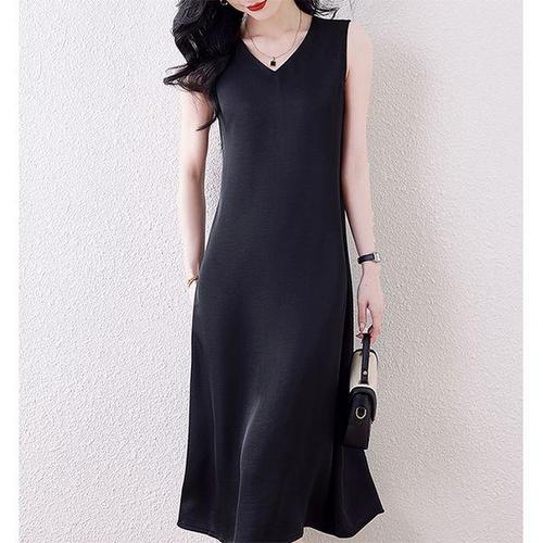[신상오픈런]여성용 블랙 브이넥 민소매 롱 원피스 진주 버튼 클래식 디자인