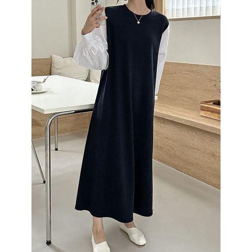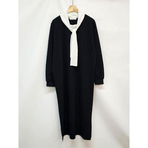 샵앤) 국산 여성 라운드 투톤 배색 주름 오버핏 롱원피스 LL-WDR-4671-블랙