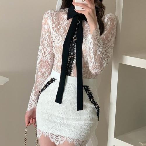 [다잇템][다잇템] 여자 리본 패턴 비침 레이스 모임룩 카라넥 블라우스_23918920_588872