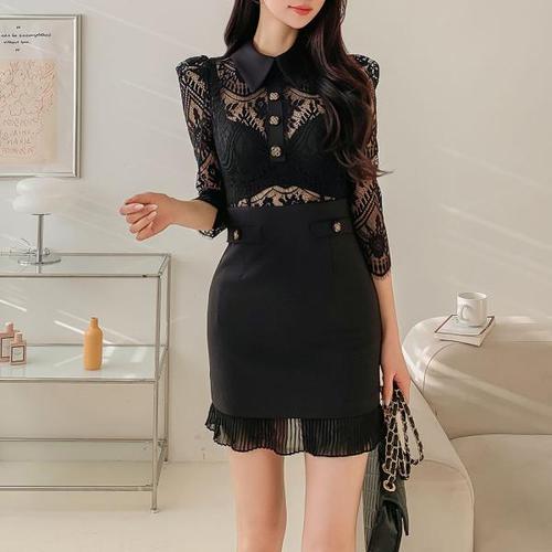 [옷자락]여자 모임룩 칠부 카라 비침 꽃무늬 레이스 미니원피스