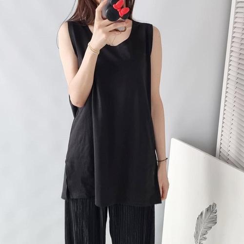빅사이즈 여성의류 레이어드 20수 이너 롱 나시 민소매 옆트임 티셔츠 오버핏 루즈 봄 여름 사계절 66-110 size