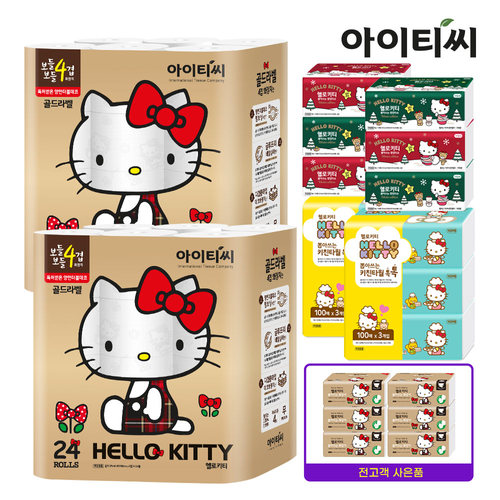 A[헬로키티 골드라벨] 더블데코 4겹 프리미엄 화장지 30롤 2팩 + 팝업티슈 6팩 + 키친타올 6팩