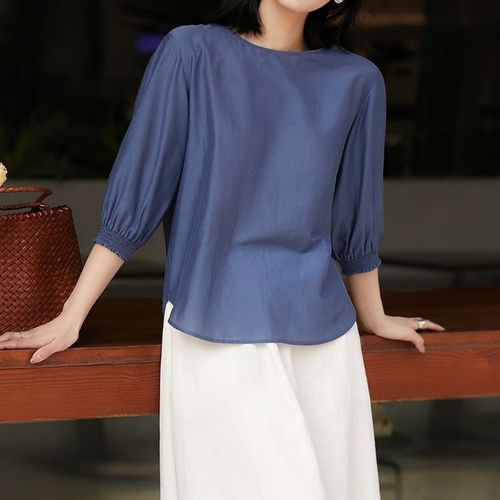 오피스 레이디 탑 여름 짧은 소매 오-넥 블라우스 새틴 블라우스 여성 셔츠 심플 솔리드 캐주얼 루즈 셔츠 블루사스 DF4904