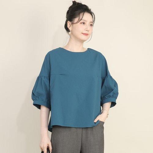 [애비뉴투지]엄마옷 시어서커 퍼프 드랍숄더 라운드 여성 여름 간절기 칠부 루즈핏 블라우스 B09517