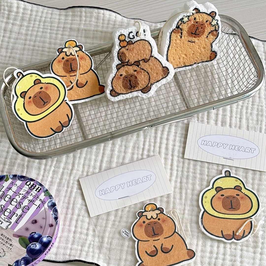 카피바라 압축 수세미 4P세트 부풀어 셀룰로오스 스펀지 주방 설거지