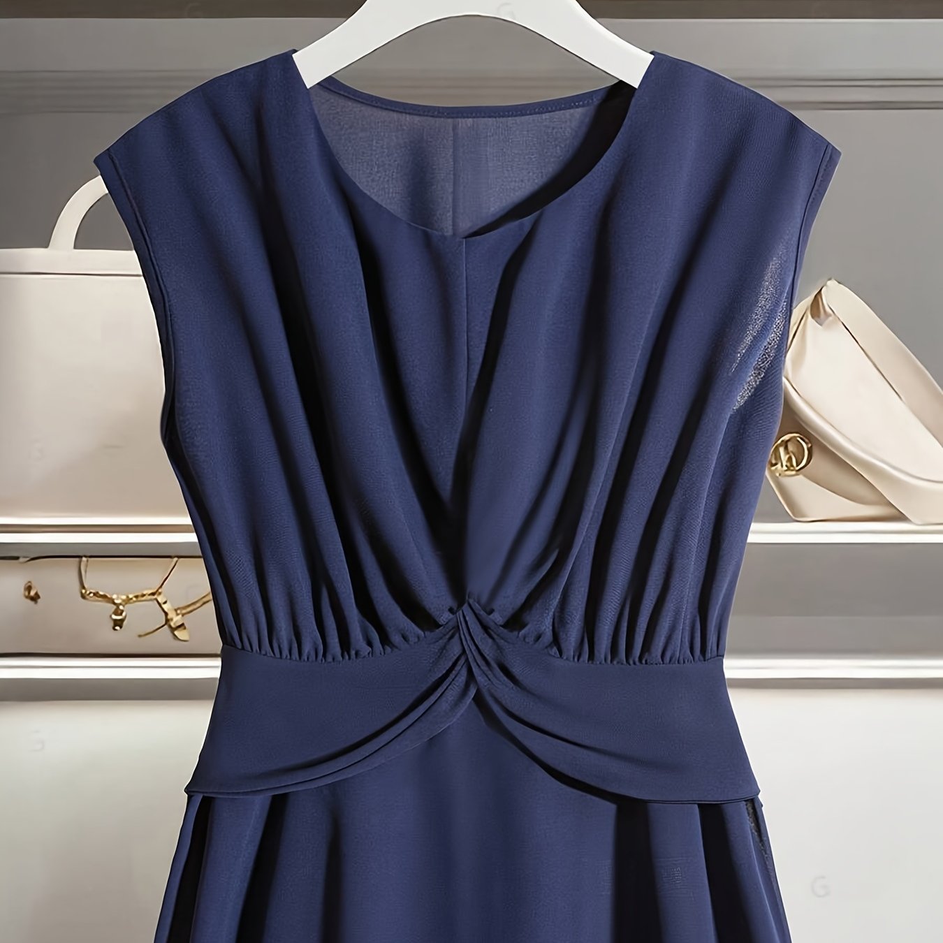 TEMU 그레이트 프랑스 허리 슬리브리스 블루 블라우스 - 크루 넥, 단색, 가벼운 폴리에스테르, 여름 여성 패션 상의, 프릴 헴 및 벨트 디테일, 여성용 블라우스