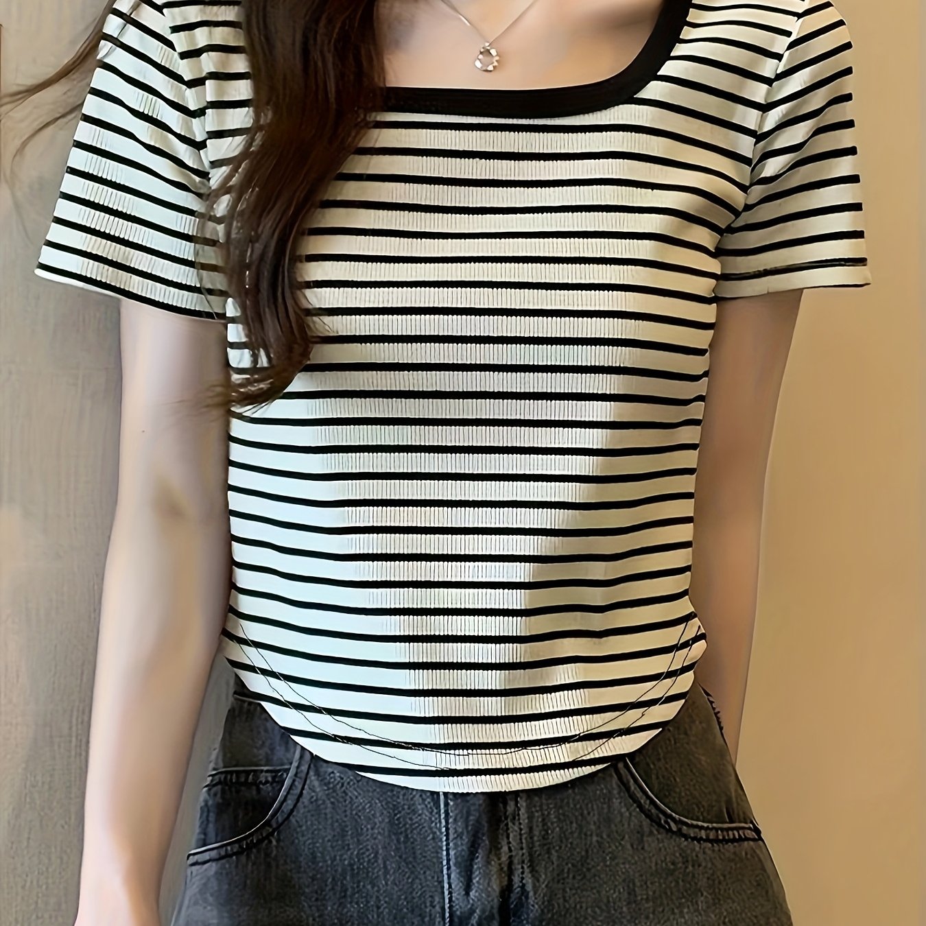 TEMU 여성용 스퀘어넥 크롭 티셔츠 - 고탄력 슬림핏 캐주얼 탑, 블랙 & 화이트 가로줄무늬, 봄 여름 가을 세탁기 사용 가능