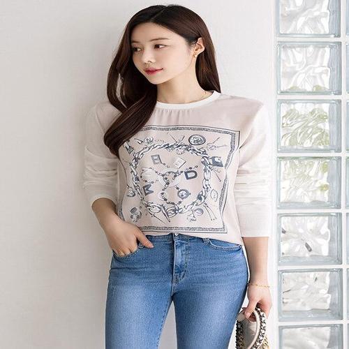 [스타일온미][루이스엔젤] 미라즌 에스닉 체인 프린팅 배색 라운드 티셔츠