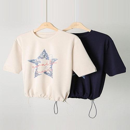 [스타일온미][루이스엔젤] 몽드 스타 스팽글 프린팅 트임소매 스트링 티셔츠