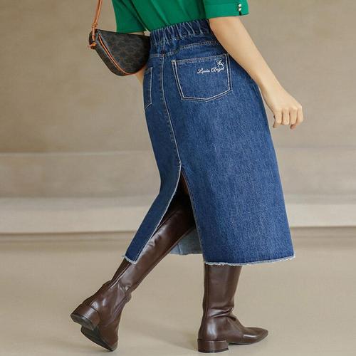 [스타일온미][루이스엔젤] 엔젤 레터링 자수 뒷 밴딩 데님 세미 A라인 롱 스커트
