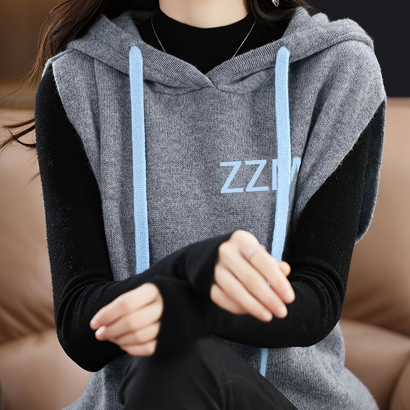 TEMU 우아한 V넥 후드가 달린 니트 조끼, 솔리드 컬러 비스코스 풀오버, 세련된 레터링 디자인, 다재다능한 올 시즌 착용 가능