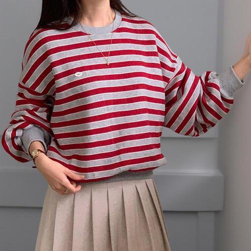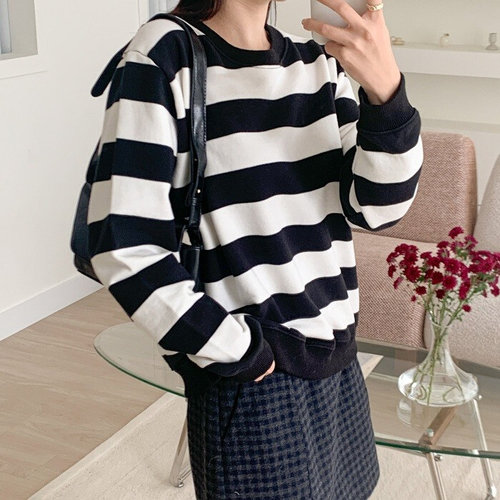 [에이치플러스몰]여성루즈핏맨투맨 1P 여자 스트라이프 시보리 티셔츠