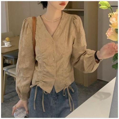 피어니스트 브이넥 스트링 셔링 단추 블라우스
