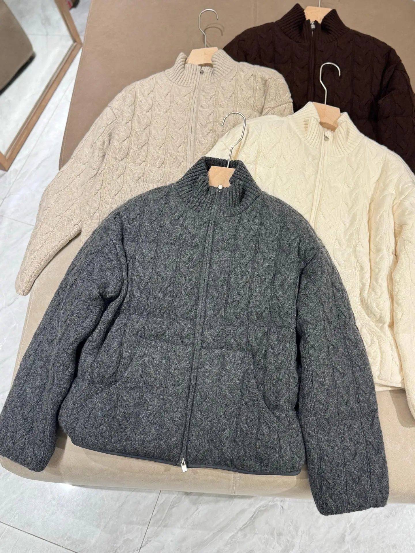 여성용 패셔너블하고 다용도로 활용 가능한 스탠드 칼라 트위스트 니트 캐시미어 구스 다운 재킷