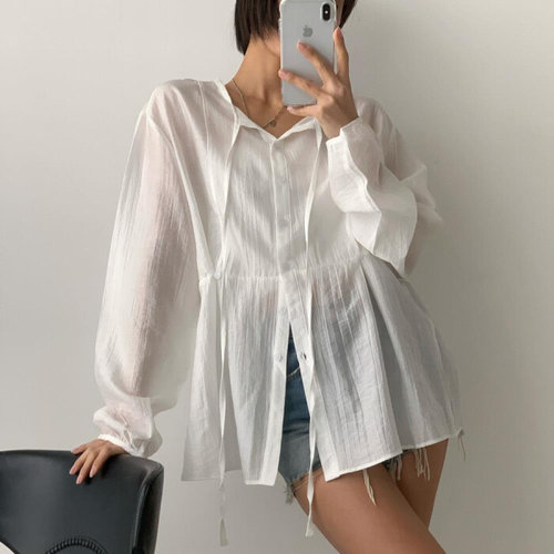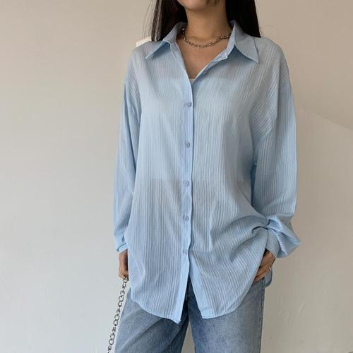 로리에 여성 시스루 셔츠 남방 루즈핏 썸머 긴팔 롱 블라우스 여름 간절기