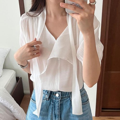 여자 롱타이 투웨이 러플 시스루 반팔 블라우스