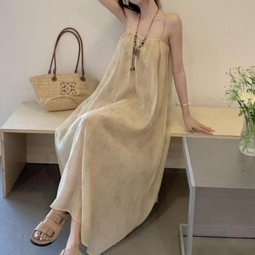 [신상오픈런]여성 아이보리 패턴 핀턱 끈나시 셔링 롱 원피스
