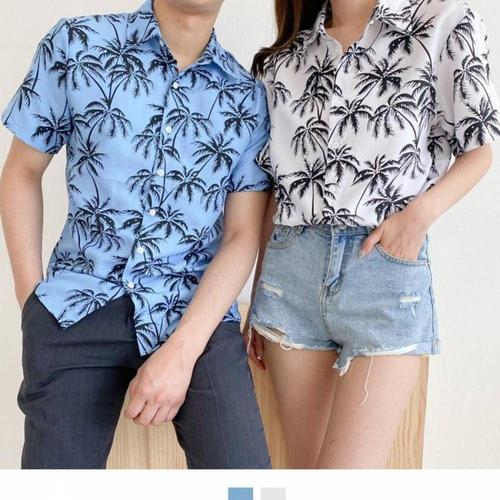 커플룩 하와이안 반팔셔츠 2color 성인 남녀공용 남성 여성 남자 여자 비치 야자수 바캉스 커플셔츠