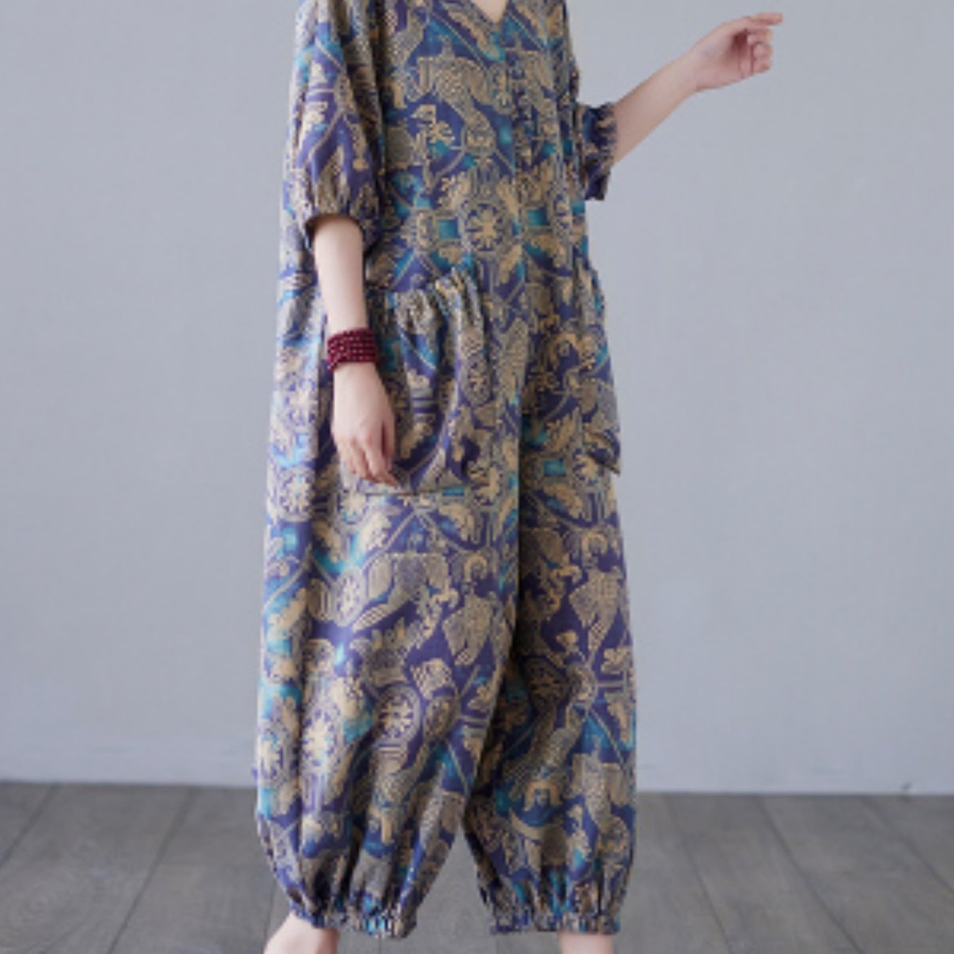 TEMU 2025 여름 신상 프린트 점프수트 여성용 루즈핏 V넥 9포인트 슬리밍 트렌드