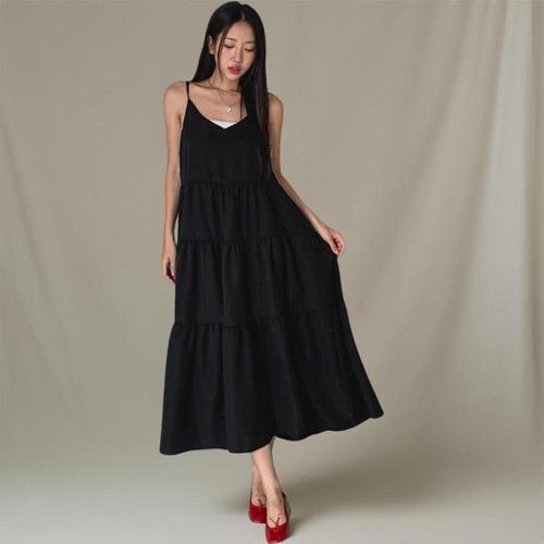 [옷자락]여성 여름 핀턱 캉캉 셔링 어깨끈 롱 원피스
