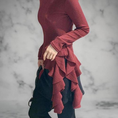 [다잇템]여성 언발란스 입술넥 긴팔티 슬림핏 프릴 니트