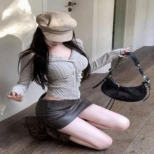 여성 스퀘어넥 골지 니트 슬림핏 긴팔티