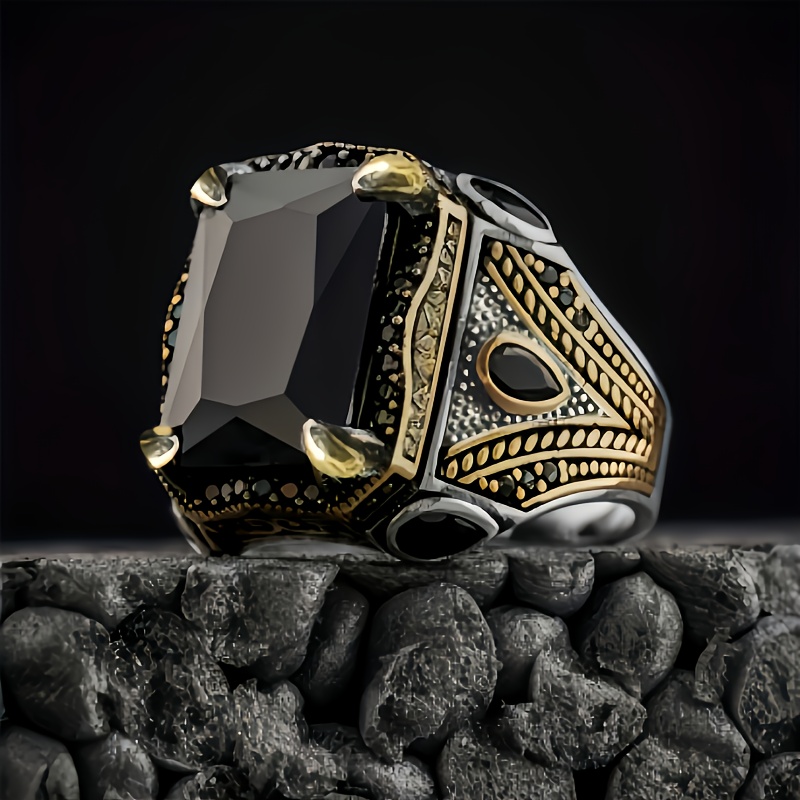 TEMU 1개 빈티지 남성용 스퀘어 블랙 합성 지르코니아 반지, 골든톤 섬세한 디테일, 내구성 있는 결혼반지, 크리스마스 발렌타인데이 선물, 연중 매일 착용 가능한 레트로 감각 액세서리