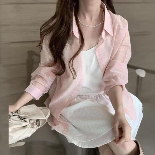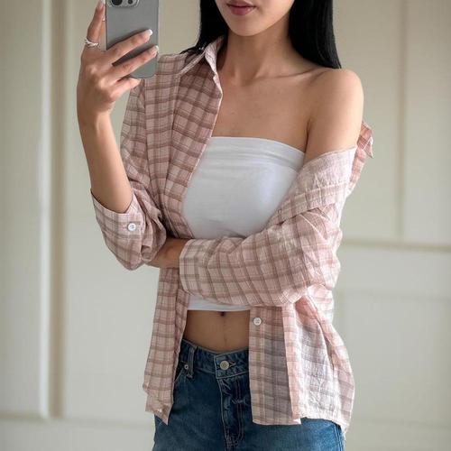 |CSH3F58|여성 루즈핏 언발란스 힙커버 시스루 여름 긴팔 체크 블라우스