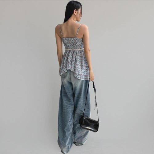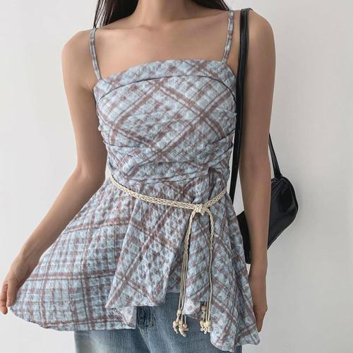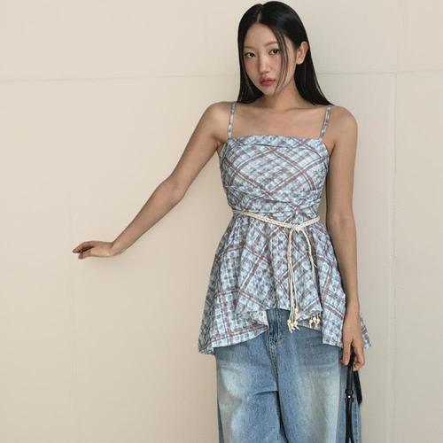 |CHH3ECD|여성 여름 체크 패턴 펀칭 허리 끈 셔링 언발란스 나시 블라우스