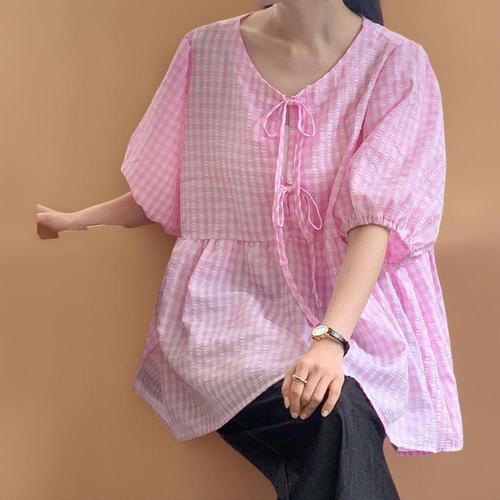 |KSH3EBC|여성용 귀여운 리본 장식 체크 패턴 여름 퍼프 블라우스