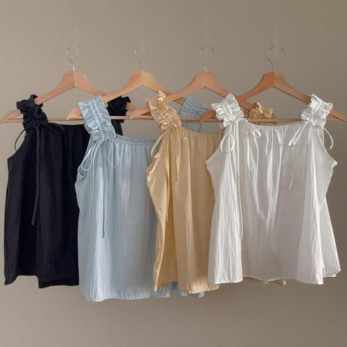 |CSH3F18|여성 여름 사랑스러운 바캉스 리본 프릴 나시 무지 블라우스