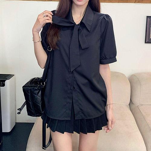 리본 카라 반팔 블라우스 여성 데일리 여름룩
